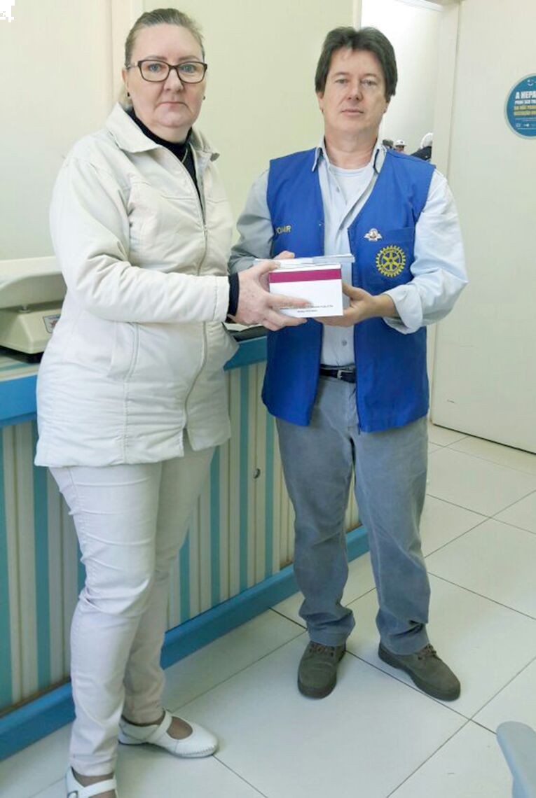 Na foto: o Rotariano Volmir Zolet entrega um dos kits de exames para a Secretaria de Saúde Ivone Bortolace.