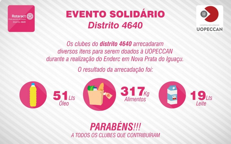 Neste último fim de semana, na abertura do ENDERC, tivemos o prazer de receber a rotariana e representante da Uopeccan, Gladys Mari Rodrigues, que veio nos brindar com uma apresentação sobre a instituição, que se dedica a atender a população em todos os aspectos relativos ao câncer - prevenção, diagnóstico, tratamento, estudos e pesquisas, bem como receber os 317 kg de alimentos, 51 litros de óleo e 19 litros de leite arrecadados pelo Distrito junto ao valor da inscrição dos associados. E o Rotaract Club de Quedas do Iguaçu também contribuiu junto à essa doação!